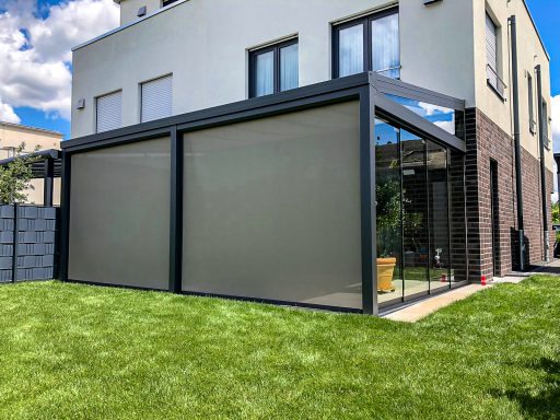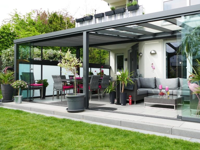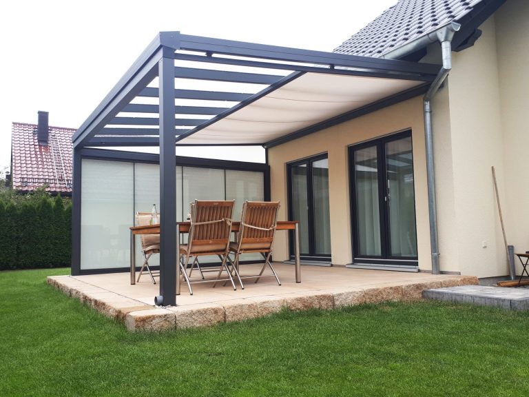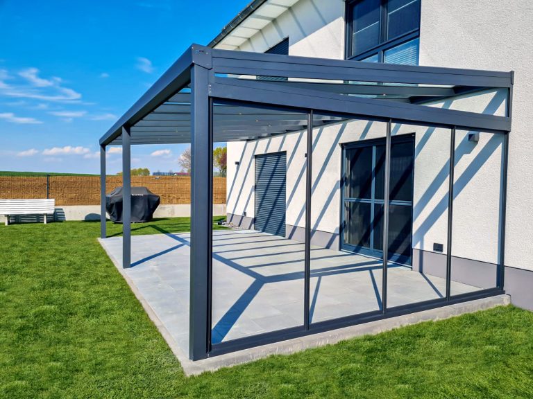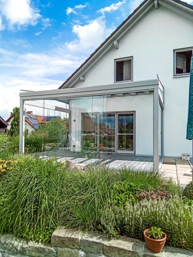 Außerdem kann die Terrassenüberdachung mit Glasschiebewänden zu einem Wintergarten gestaltet werden.