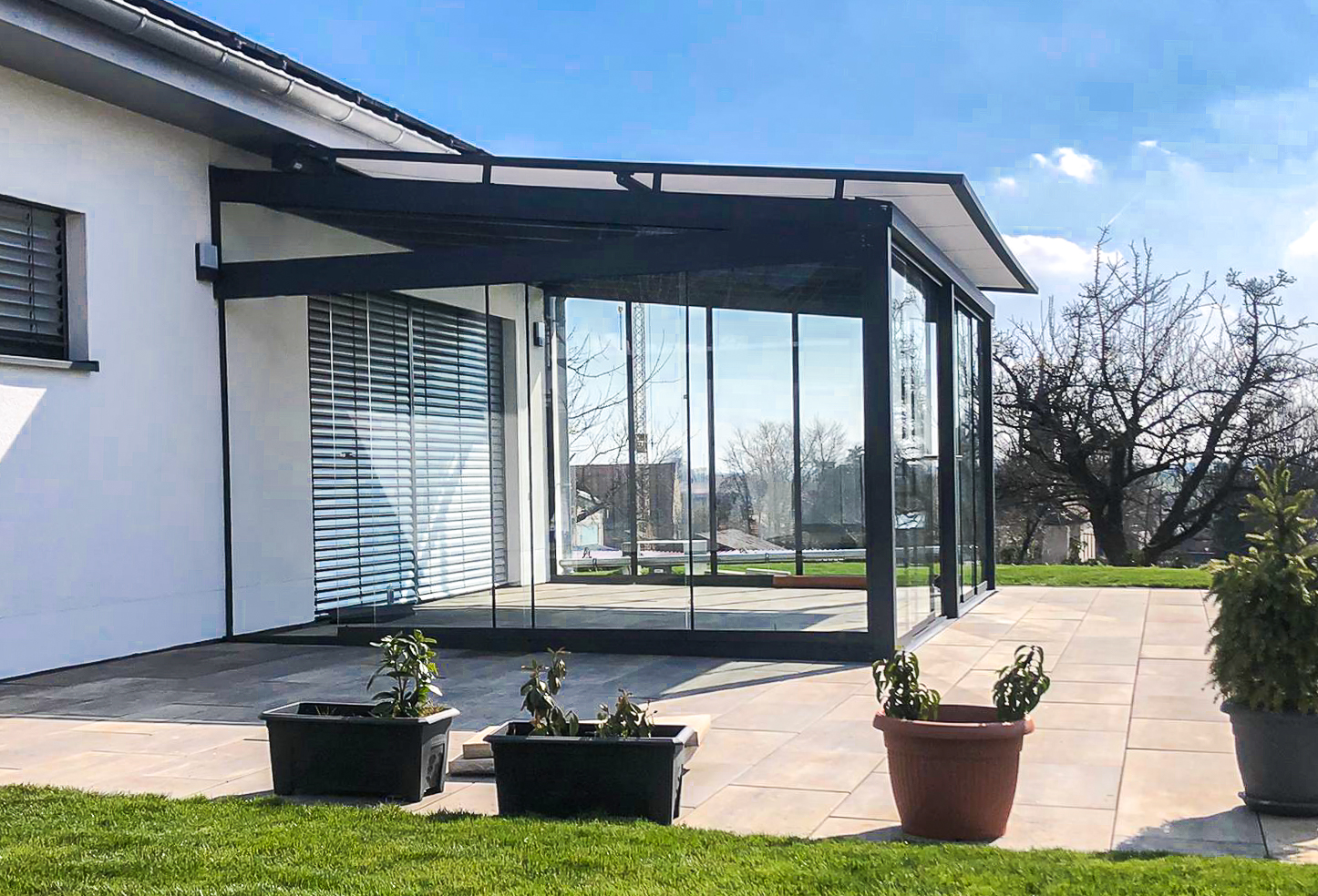 Außerdem kann die Terrassenüberdachung mit Glasschiebewänden zu einem Wintergarten gestaltet werden.